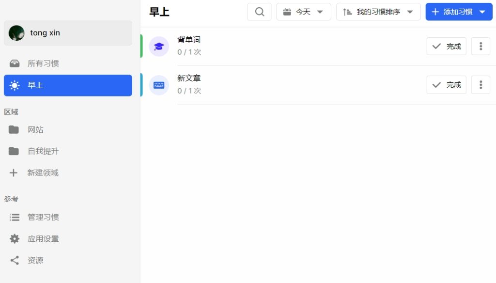 在使用 Habitify 管理和完成习惯时,它有一个很好的地方就是提供了习惯分类功能,你可以为习惯设置不同的时间和区域,在管理多个习惯时非常有效