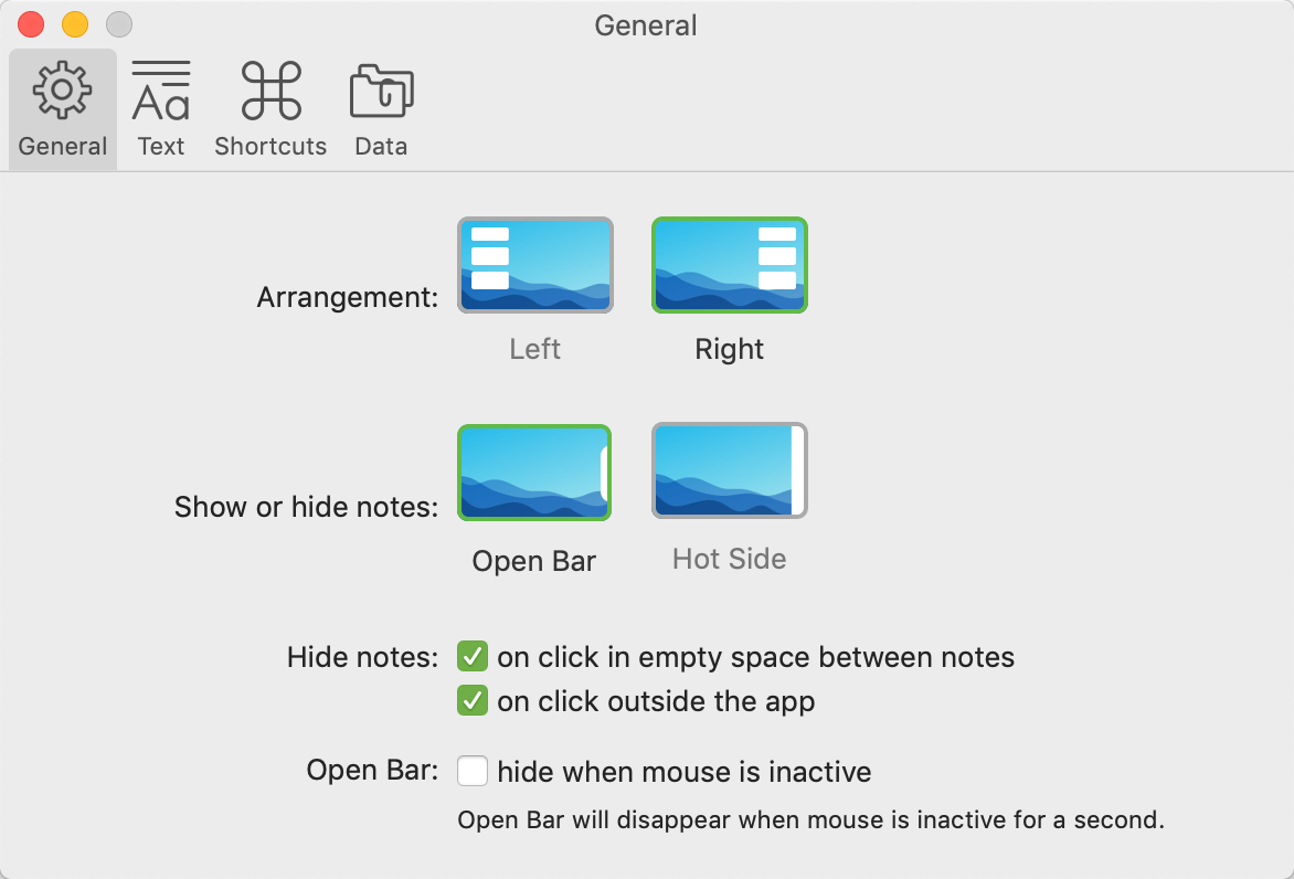 比如可以设置为Hot Side,这样当鼠标移动到侧边区域,笔记就会显示,鼠标移开,笔记隐藏,无需任何的点击;或者你也可以设置为点击控制栏显示笔记,点击笔记外的区域就隐藏笔记