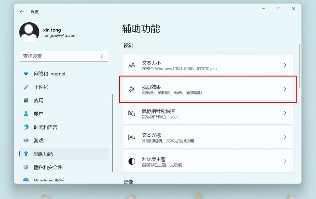 打开设置后,找到其中的 辅助功能 – 视觉效果